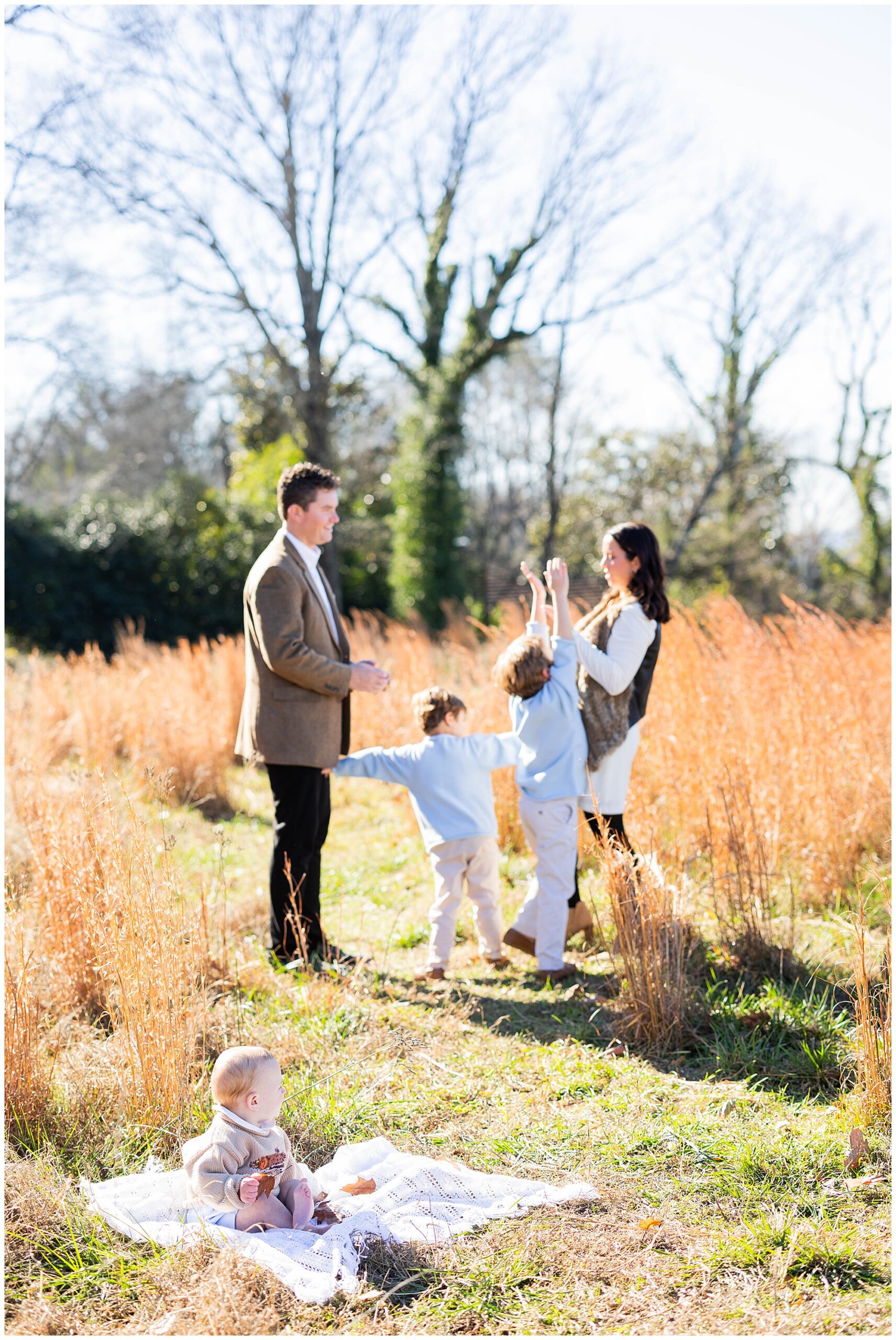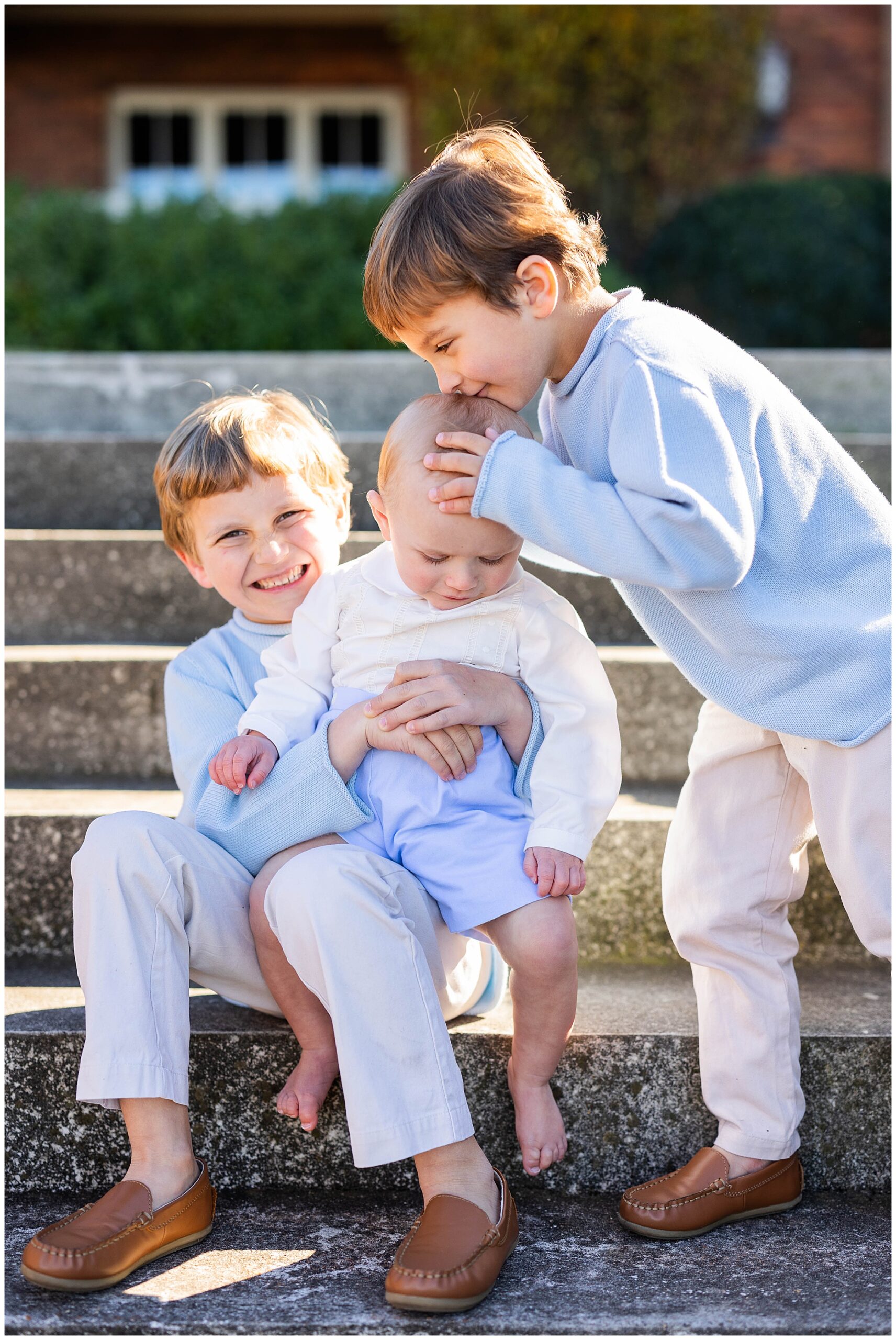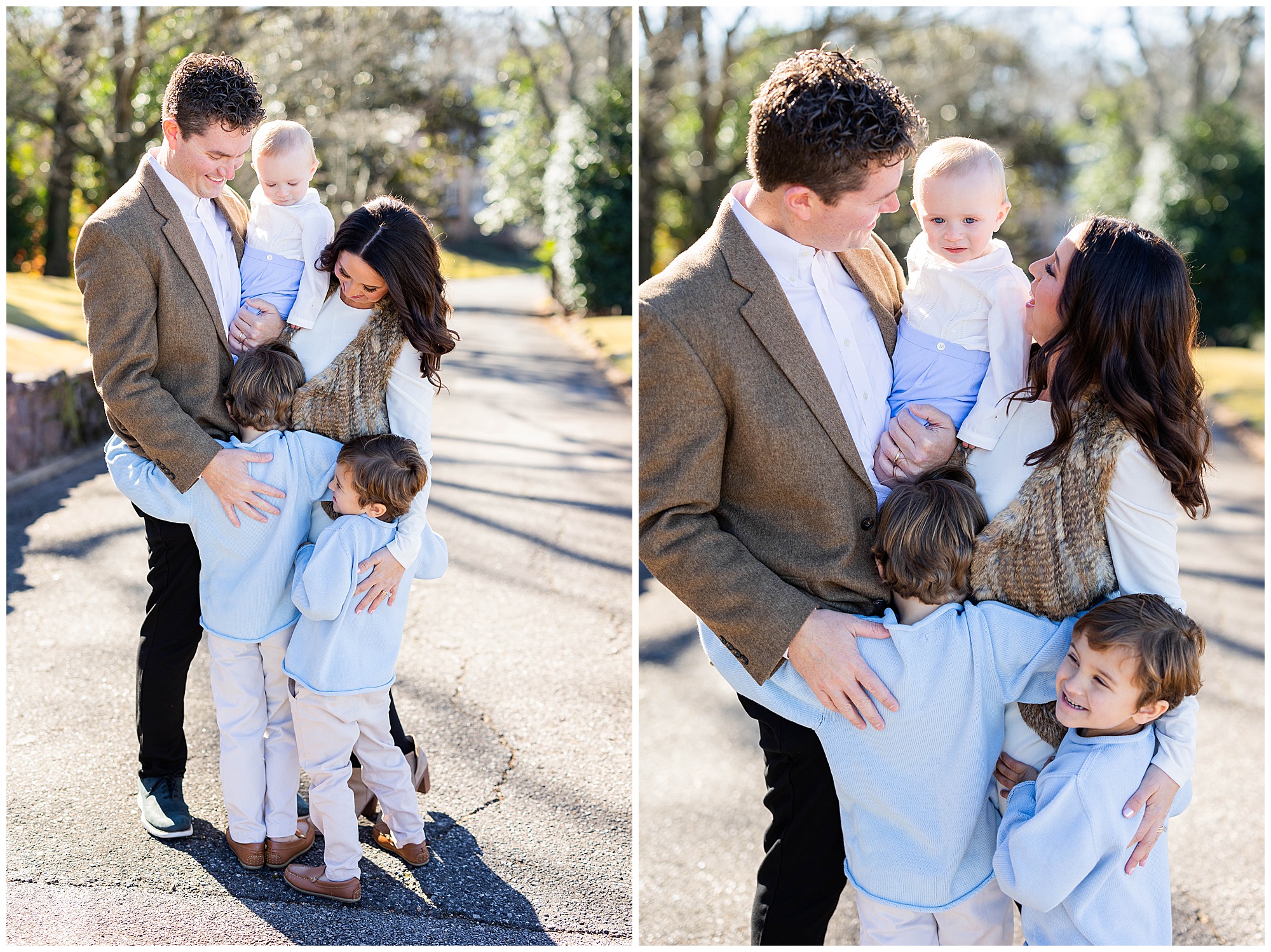 The Franklin family and I recently embarked on a chilly but charming photo session in the heart of Mountain Brook. Everett, Tatum, and James, the three adorable Franklin brothers, arrived in the coziest blue sweaters, proving that style and warmth can go hand in hand. Armed with enthusiasm, blankets and my camera, we quickly turned a freezing day into a warm and cherished memory!