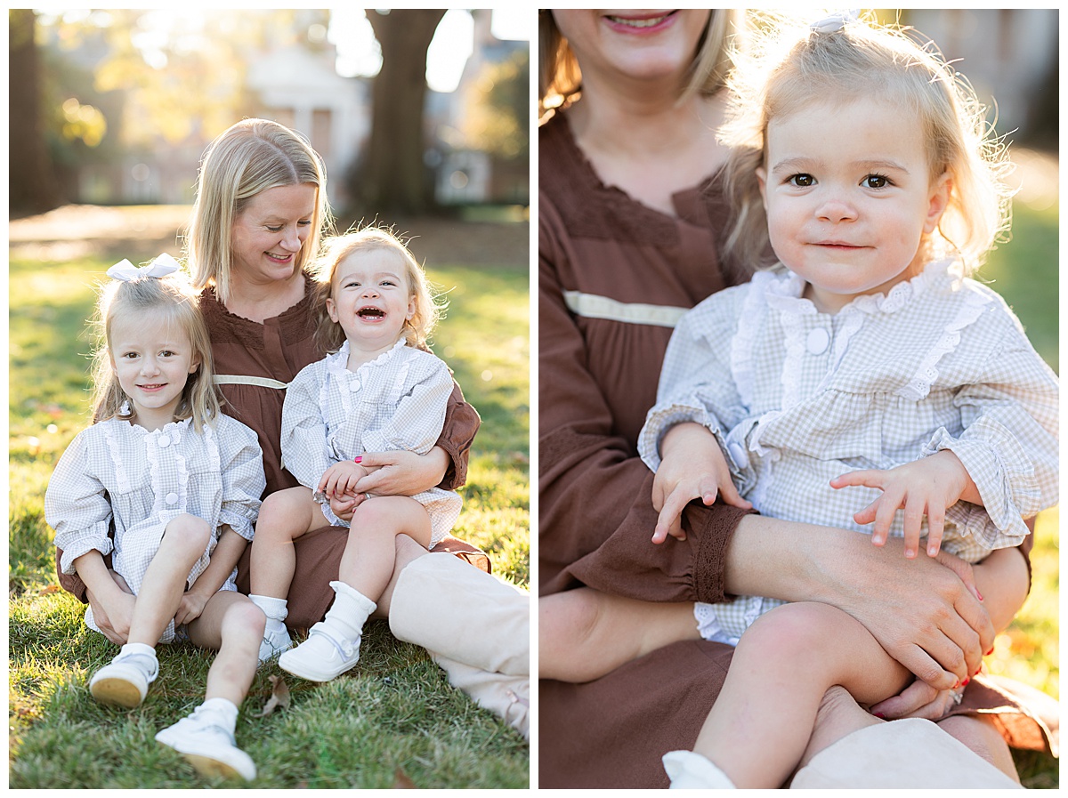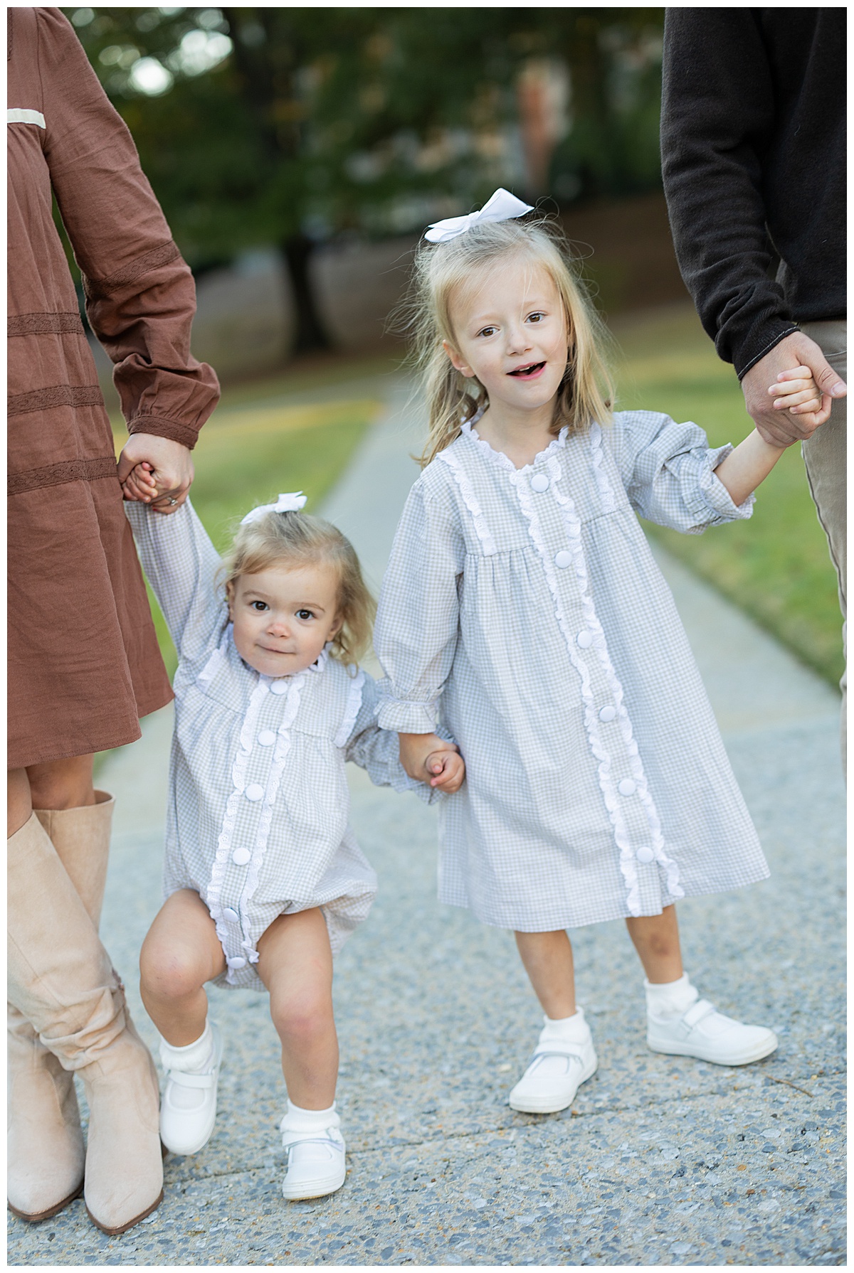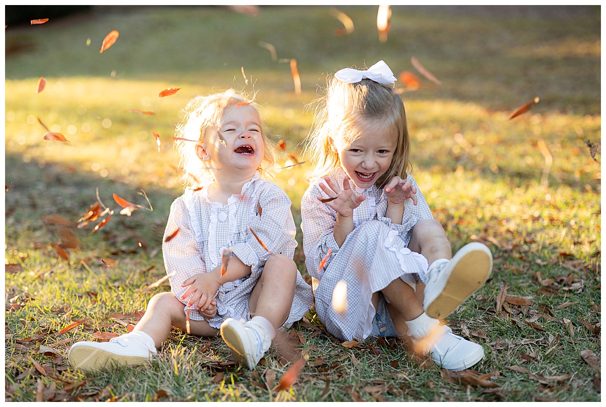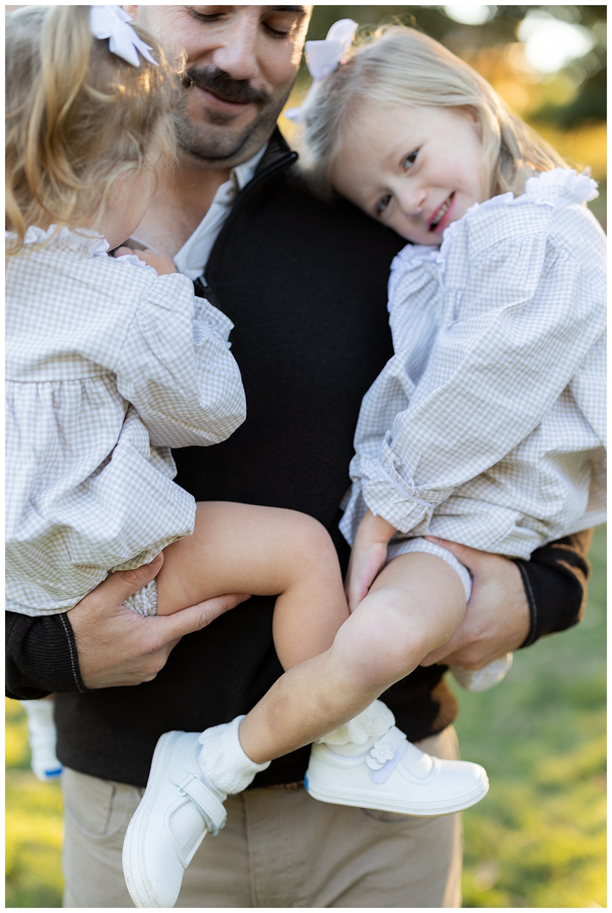 Once they got comfortable, it was game on with giggles, twirls, and the best kind of chaos! The whole family wore autumn-inspired outfits, with the two girls in most adorable matching gingham outfits! I love how easygoing this family is. They truly enjoy being together, and it always shows in their photos.