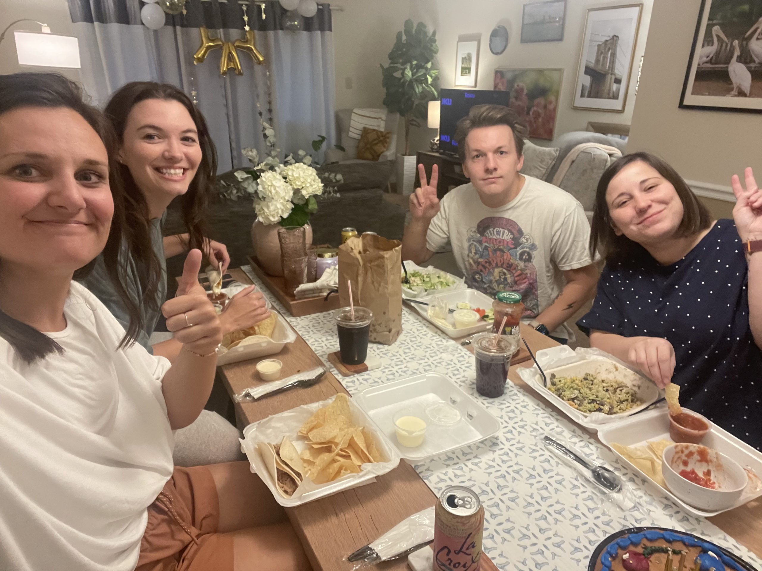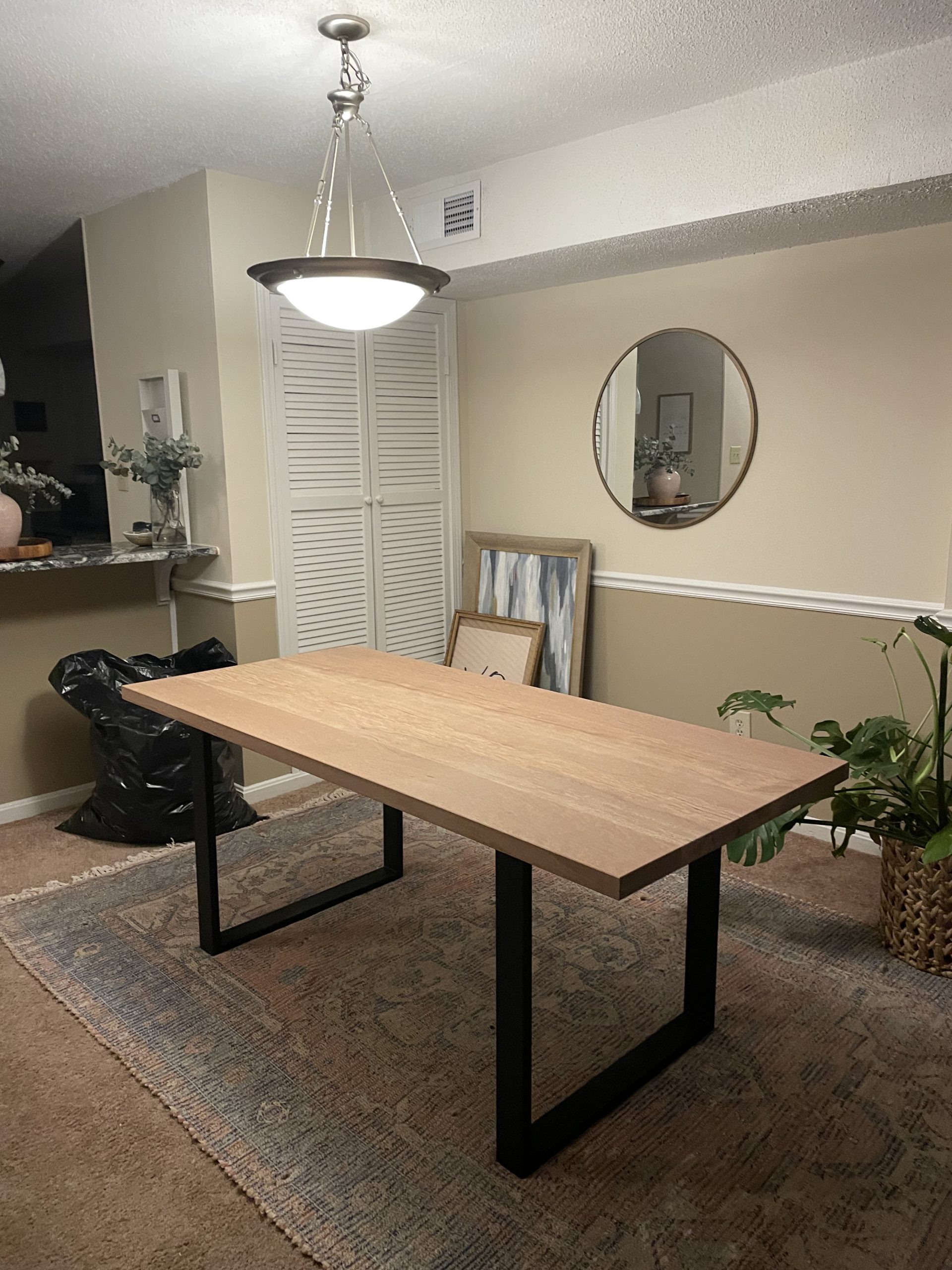 One of my best friends built me a table!!! We picked out the wood, chose the finish, bought the legs and he completed it in one weekend! My chairs still haven’t come in, hahaha, so I’m sitting on bar stools for now. So grateful for a fun new spot to host dinners!