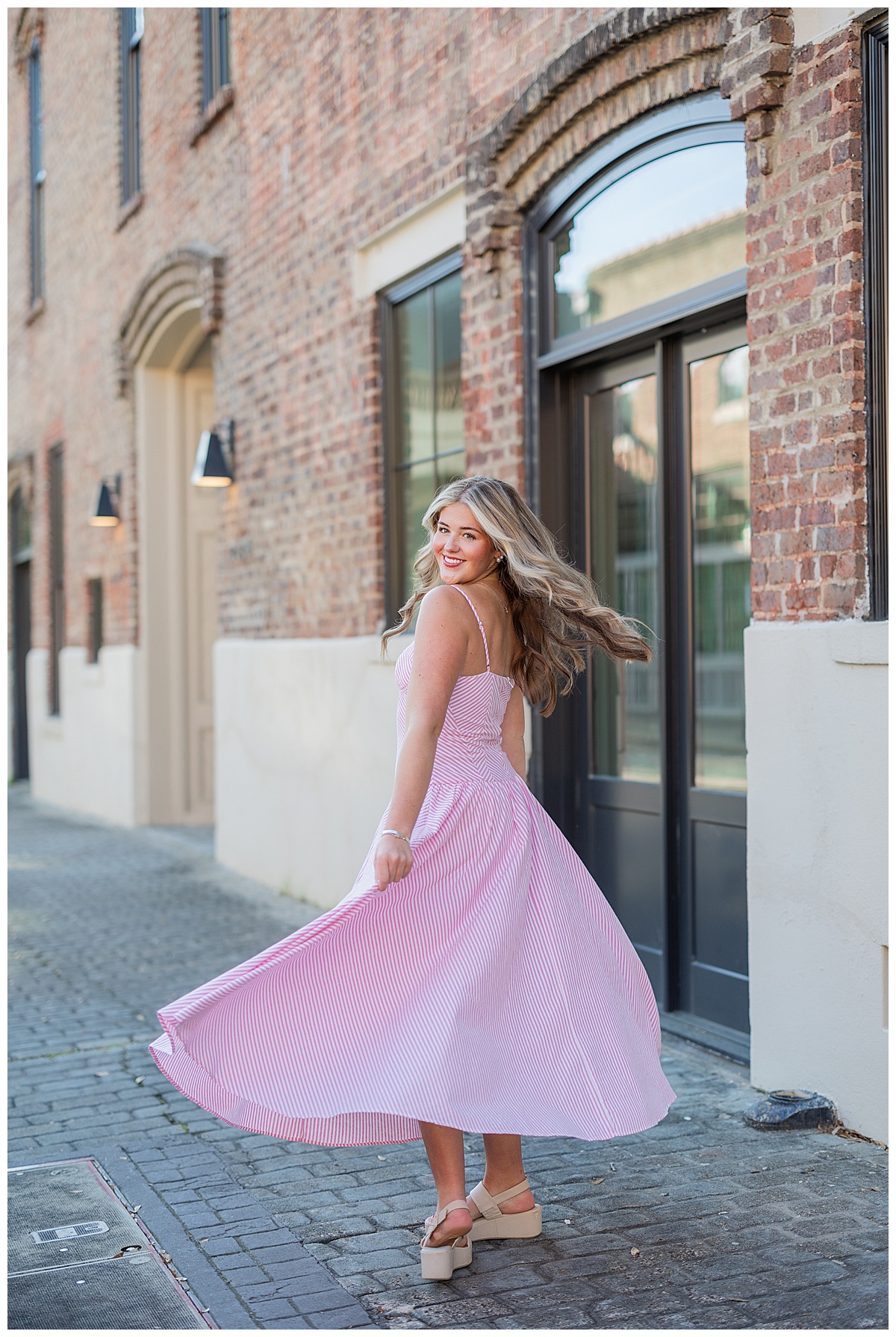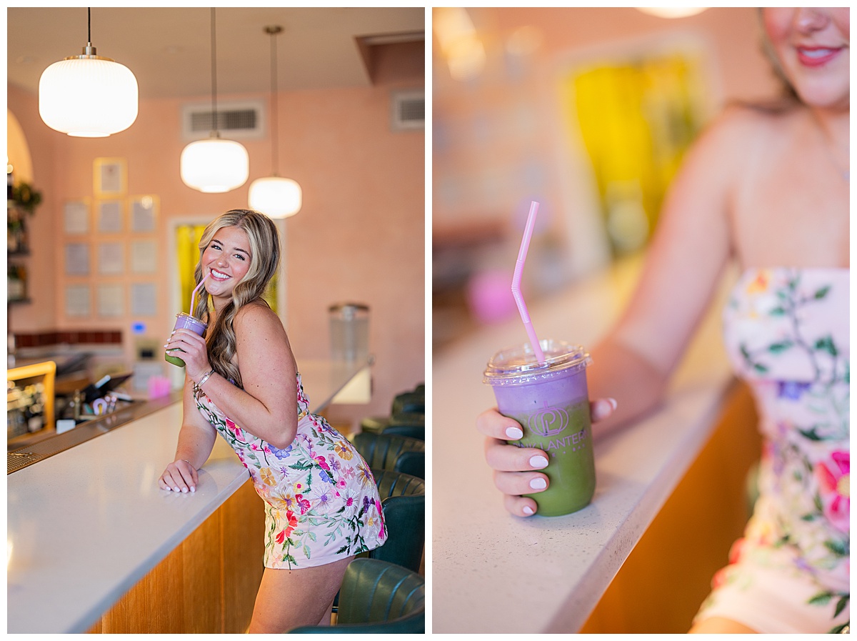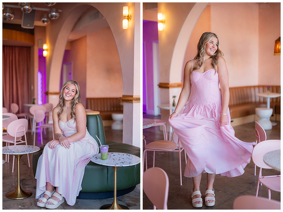 For Nora’s session, we headed to The Pink Lantern in downtown Birmingham, and it couldn’t have been a more perfect choice. This new, adorable pink coffee shop is full of personality! From colorful, creative drinks to the dreamiest aesthetic, Nora fit right into the vibe.