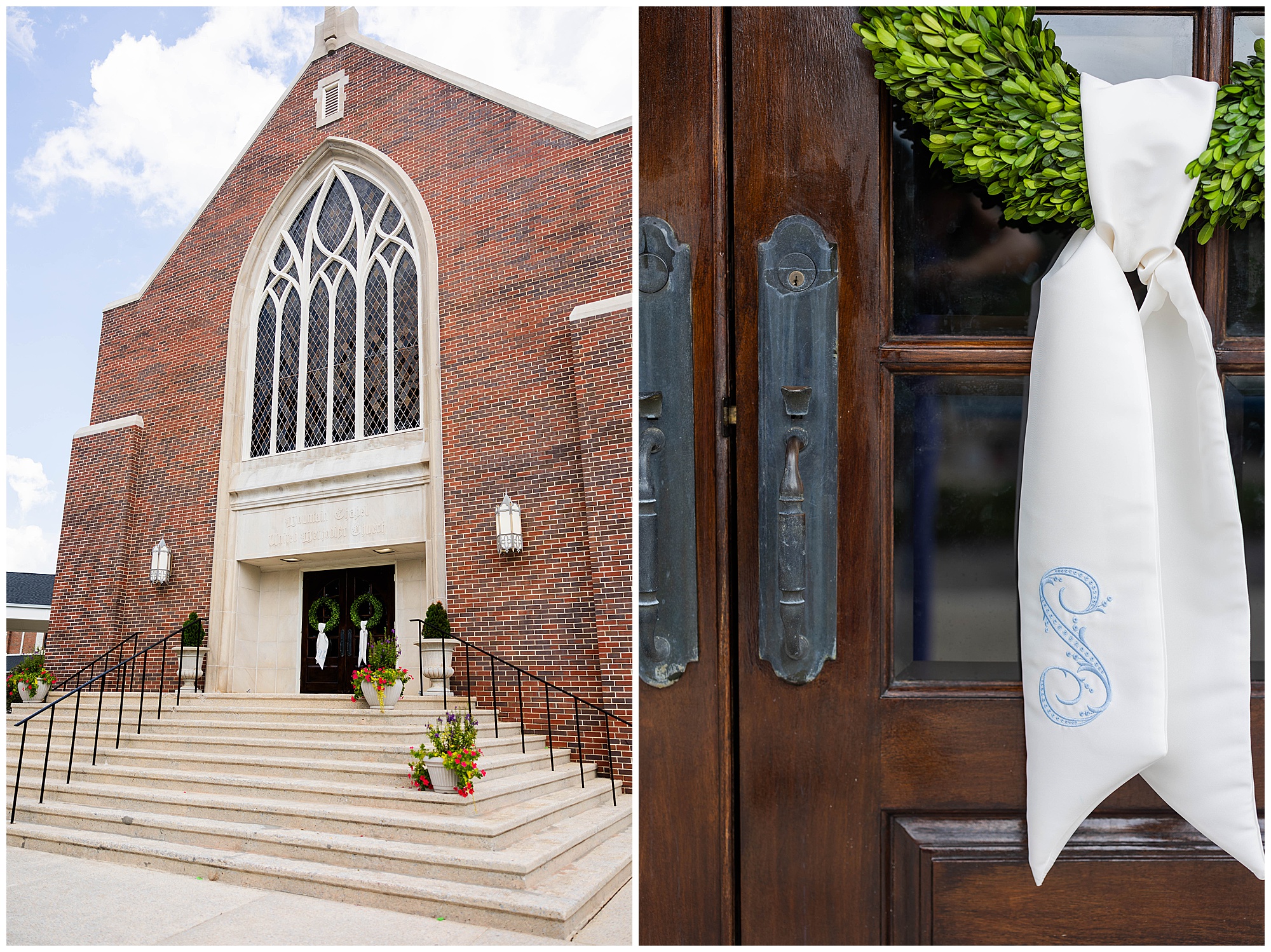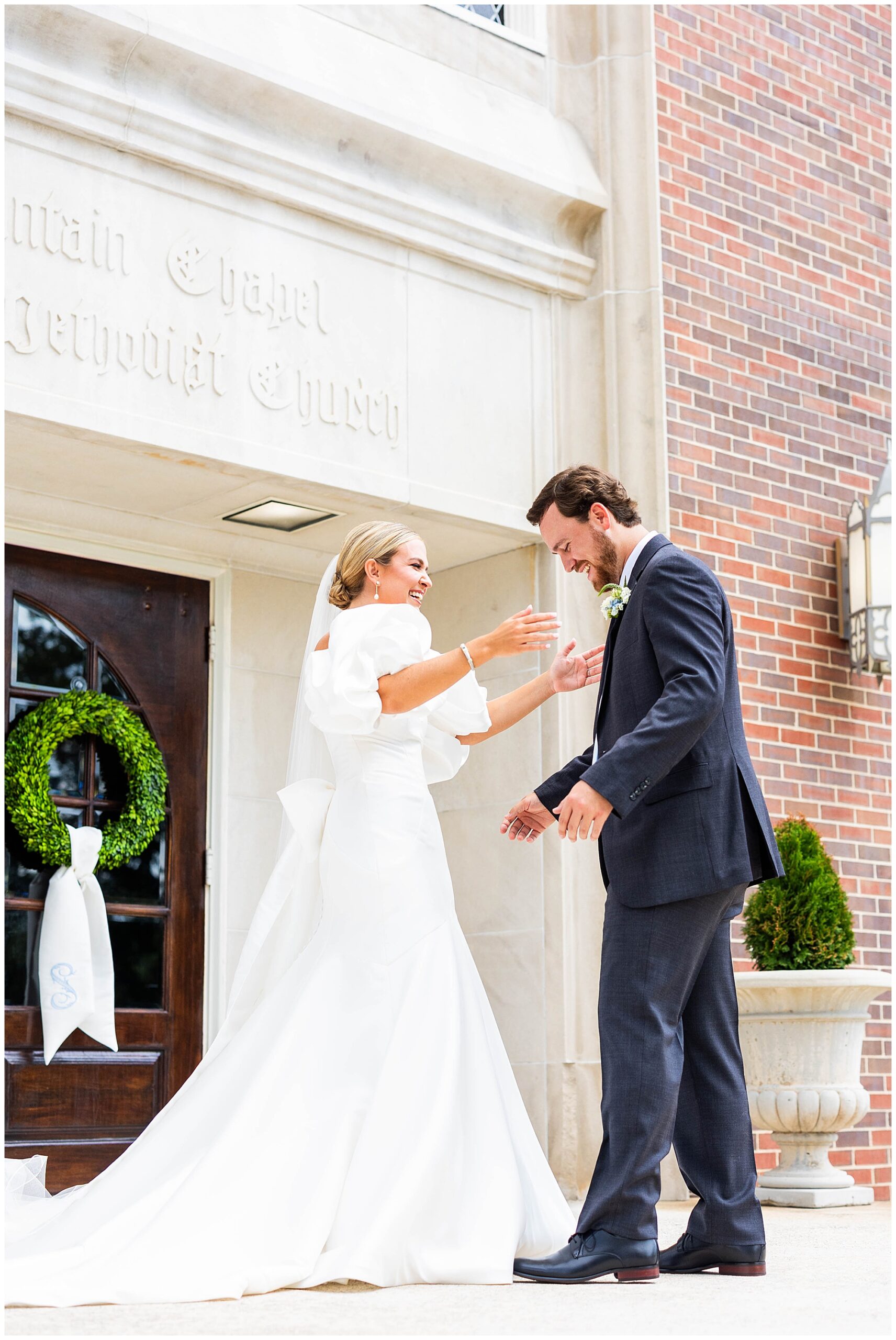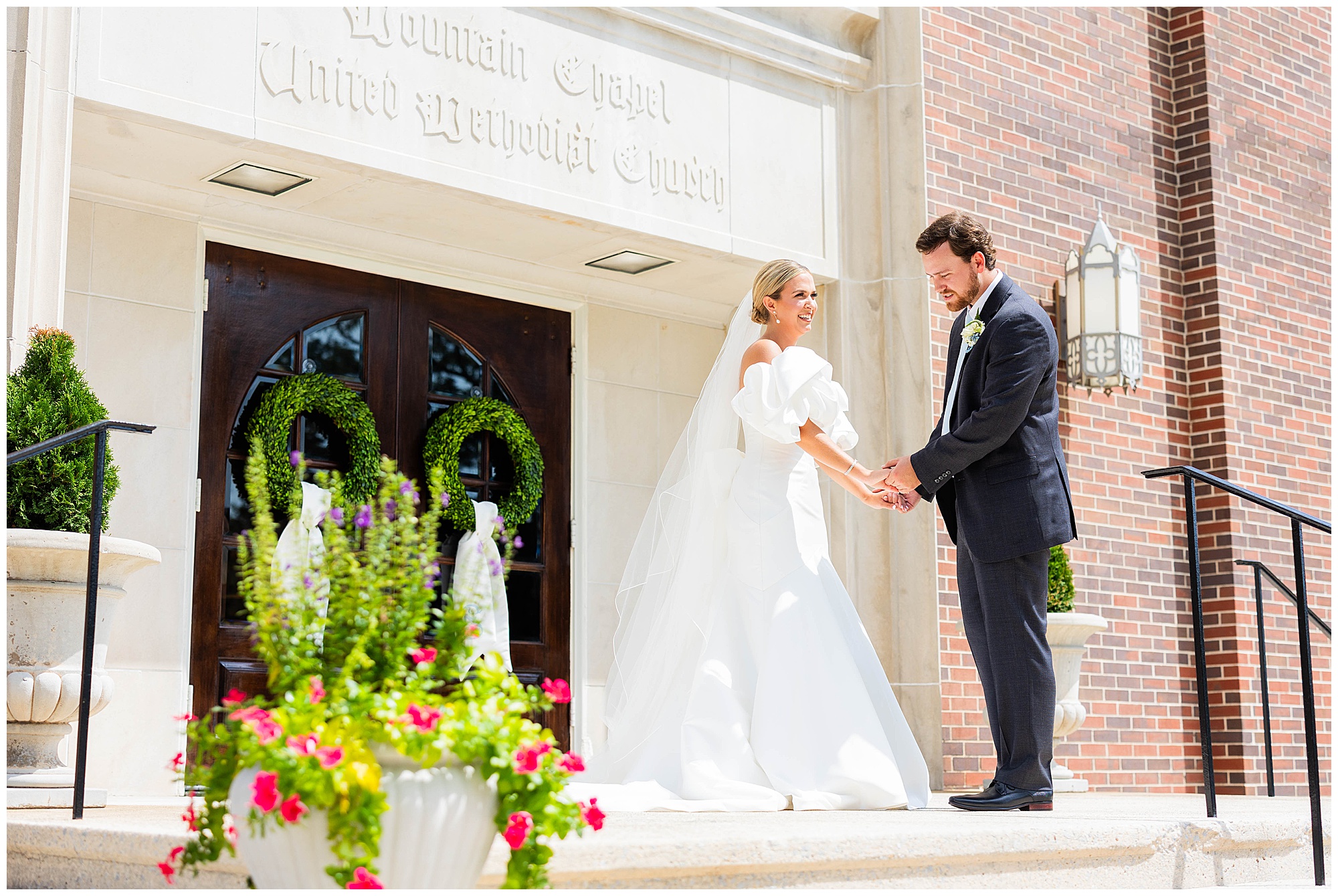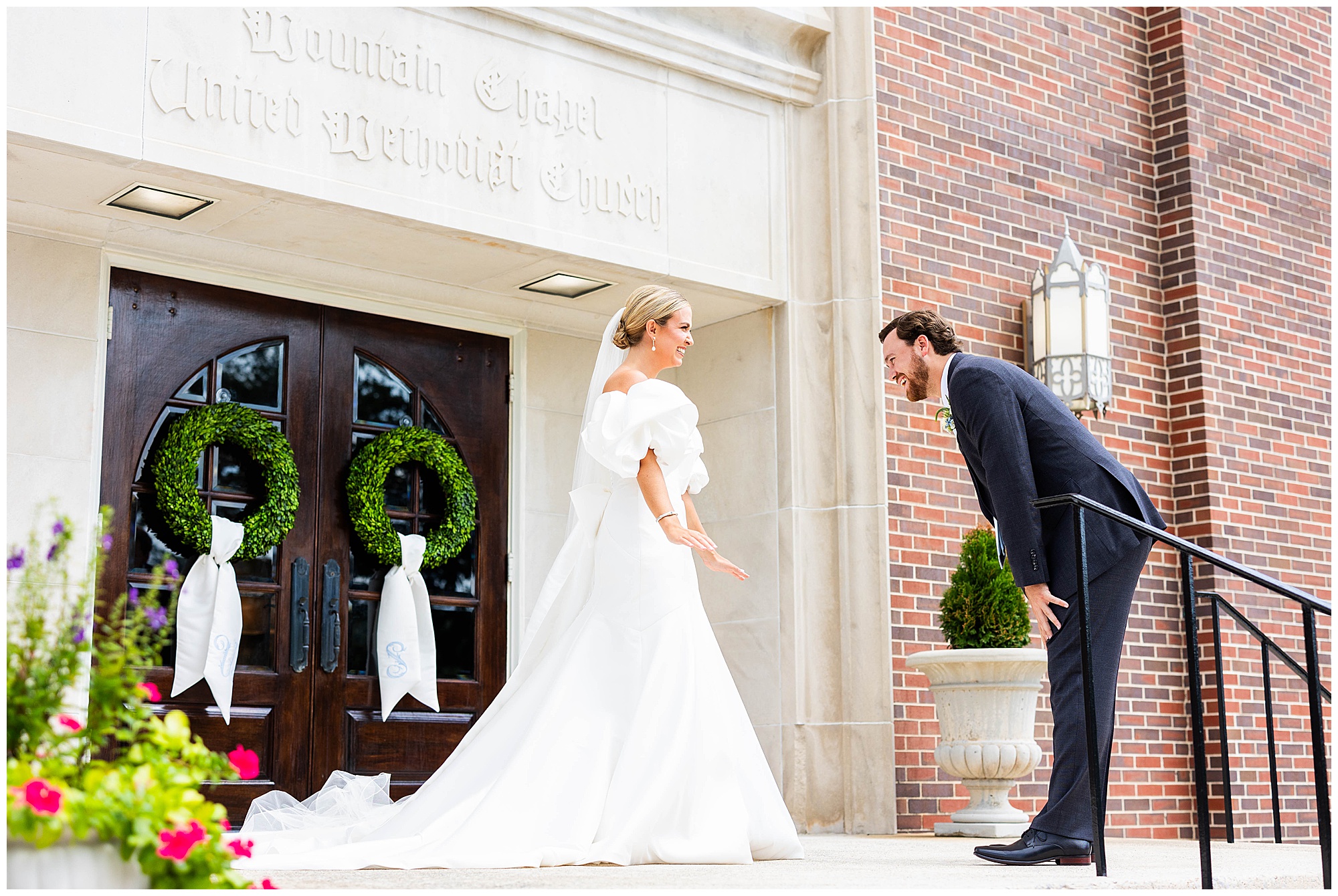 Next, we piled into cars and headed over to Mountain Chapel Methodist Church in Vestavia Hills. This ceremony venue is the church Curran grew up at, and still holds a special place in her heart. She and Ben exchanged their first look on the gorgeous front steps!