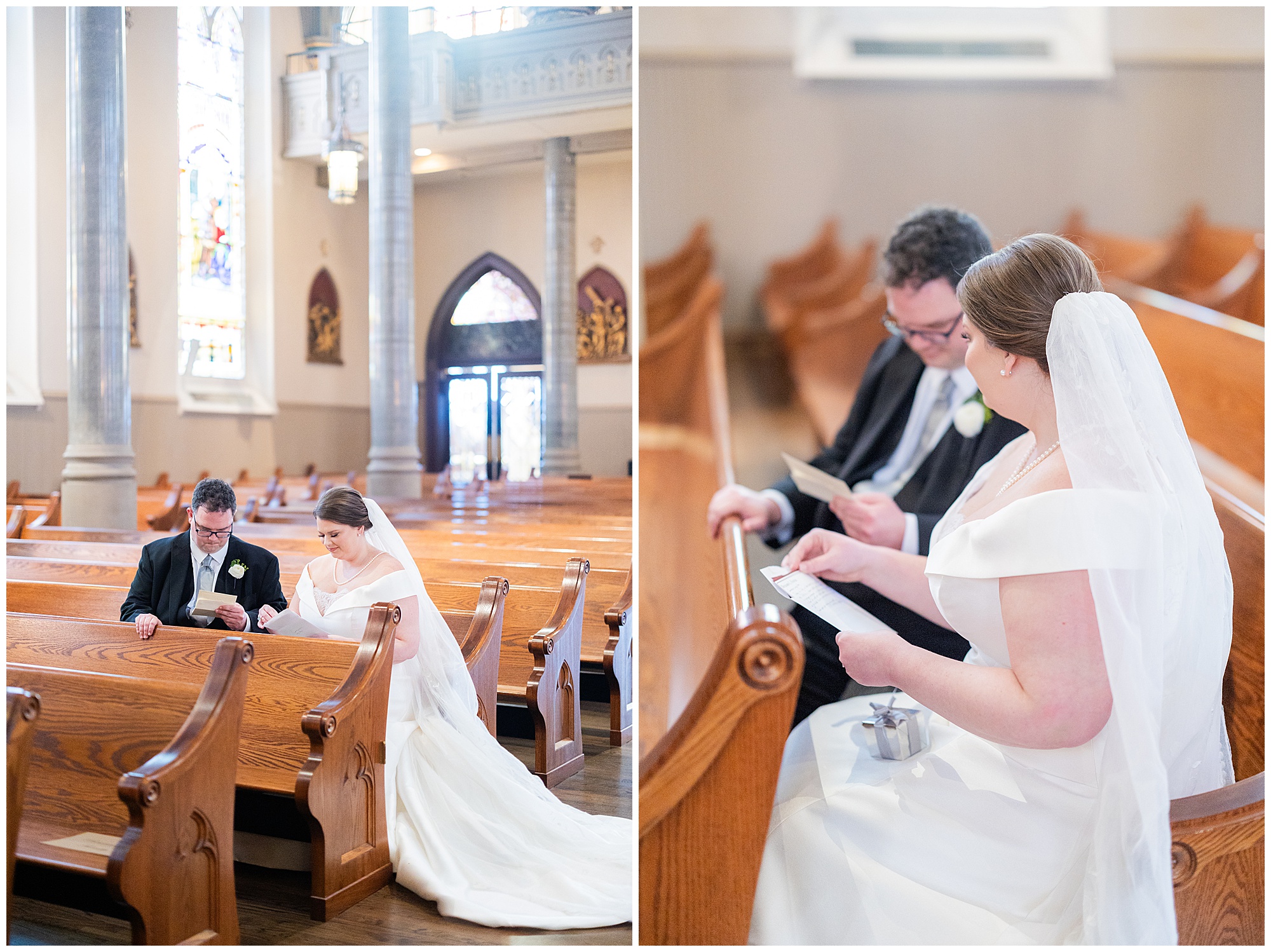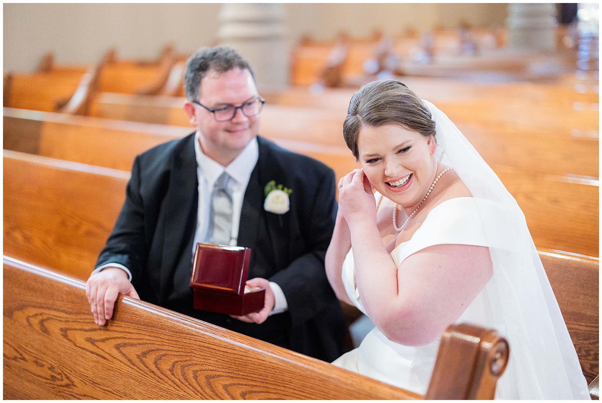 The two had written letters to each other before the big day, and after reading them both, they presented the sweetest gifts to each other. Cameron gifted Ben with an antique pocket watch, and Ben gave Cameron a pair of gorgeous pearl earrings that she put on immediately! They added the perfect touch of elegance to her bridal look. Way to go Ben!