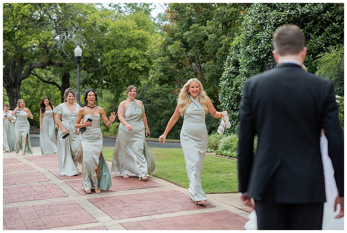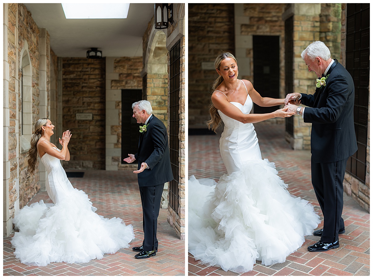 When Catherine finally stepped out in her gown, her bridesmaids’ reactions said it all — complete awe! Their light green dresses made the prettiest compliment to her classic look. Then came a tender first look with her dad, a moment full of sweet smiles and laughter.