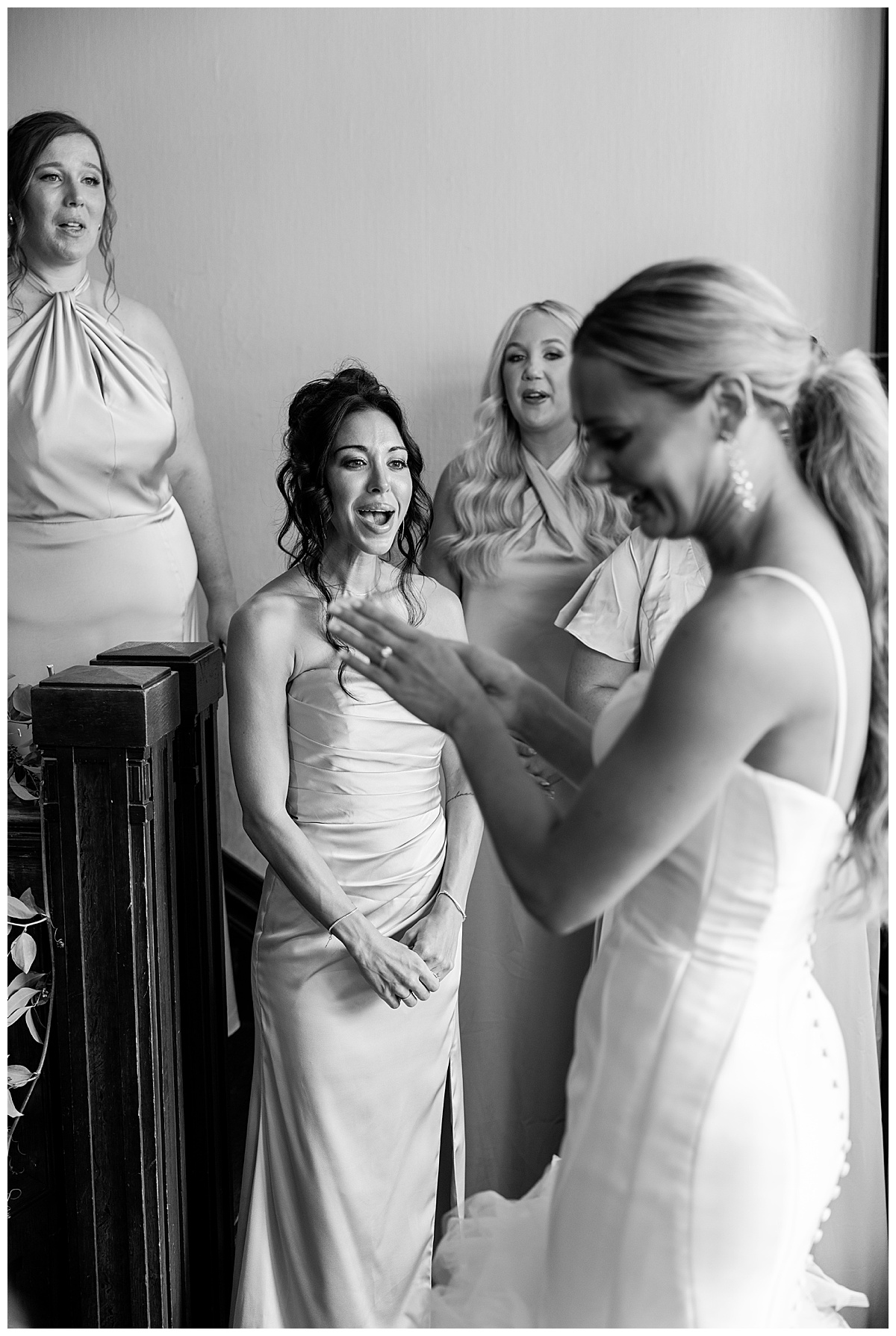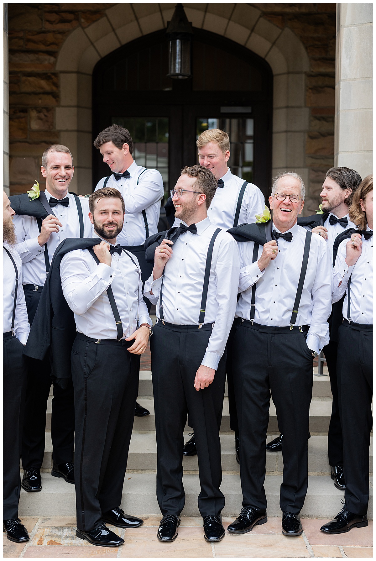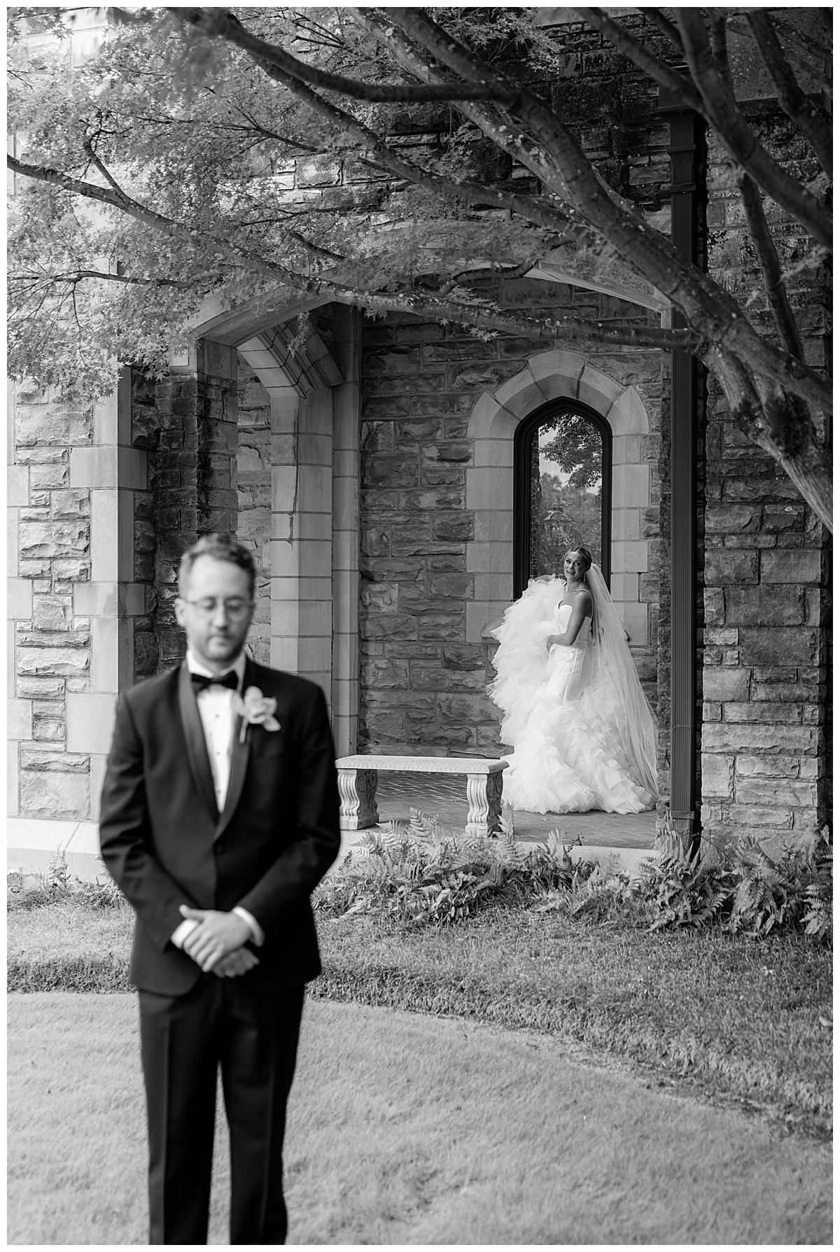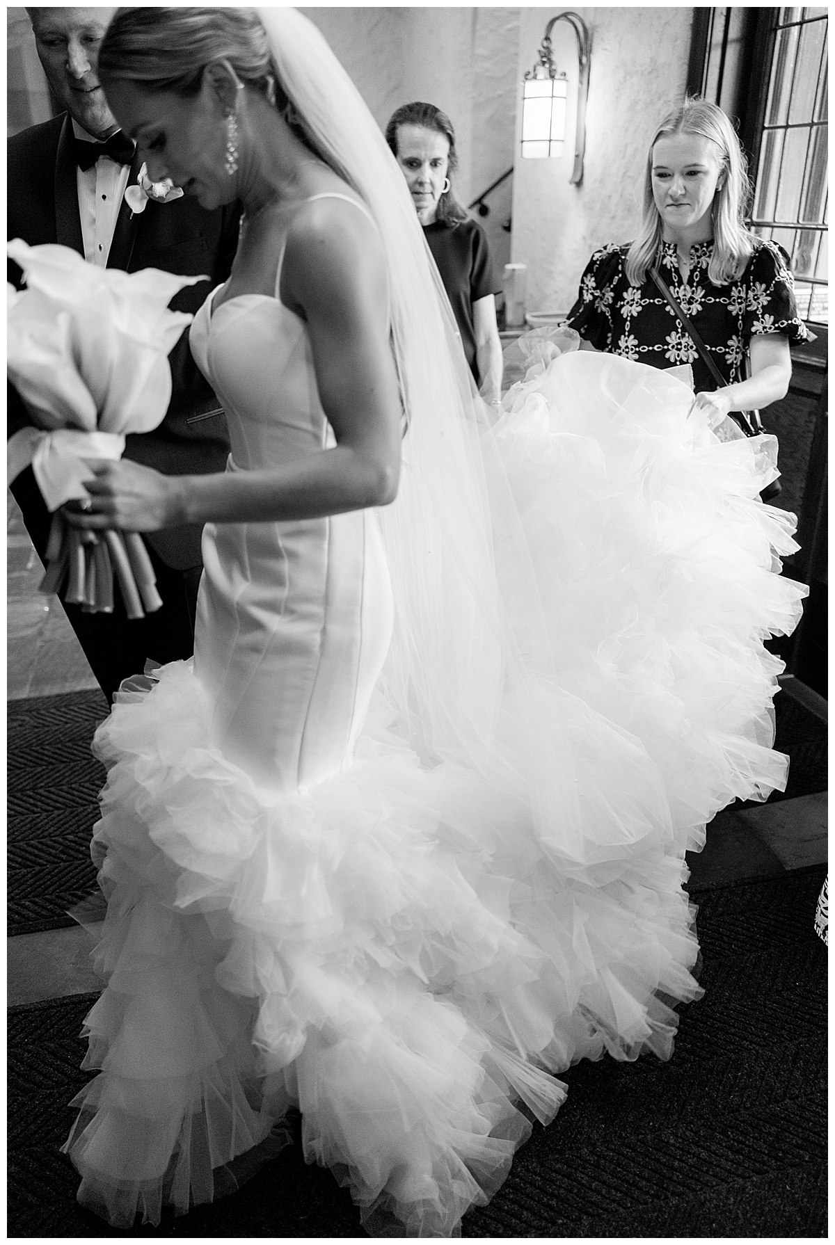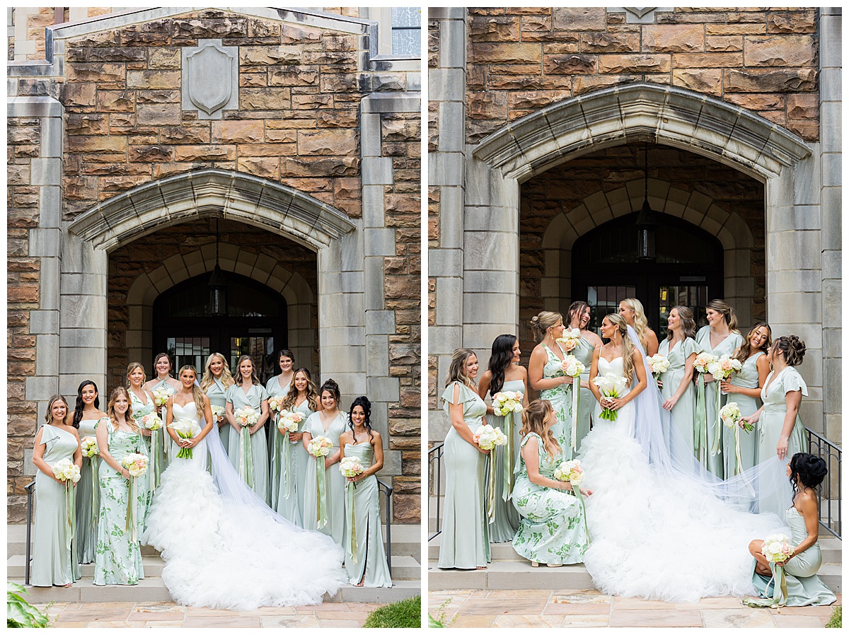 This wedding party was dressed to perfection! The groomsmen’s orchid boutonnières were truly show-stopping, and the whole group looked incredible against the stone architecture of the church. Catherine’s girls were so supportive — happily carrying Catherine’s stunning trumpet train and making sure it always looked perfect in photos.