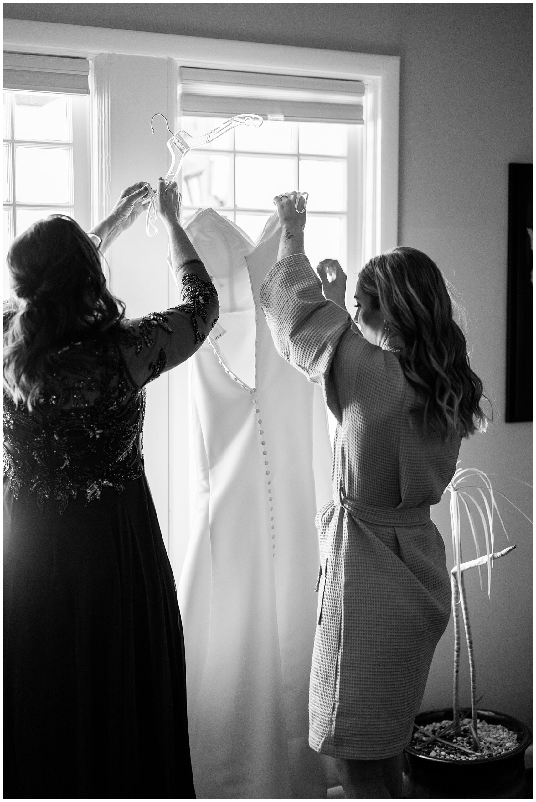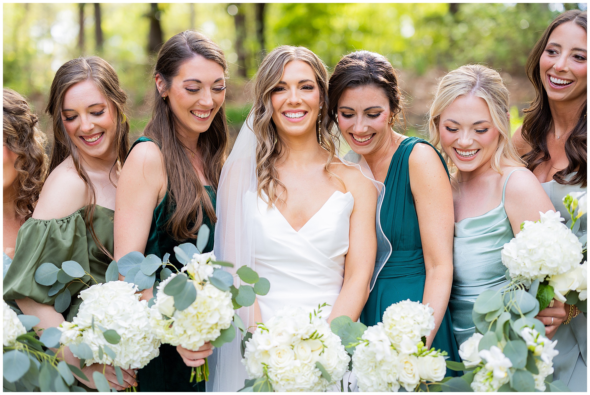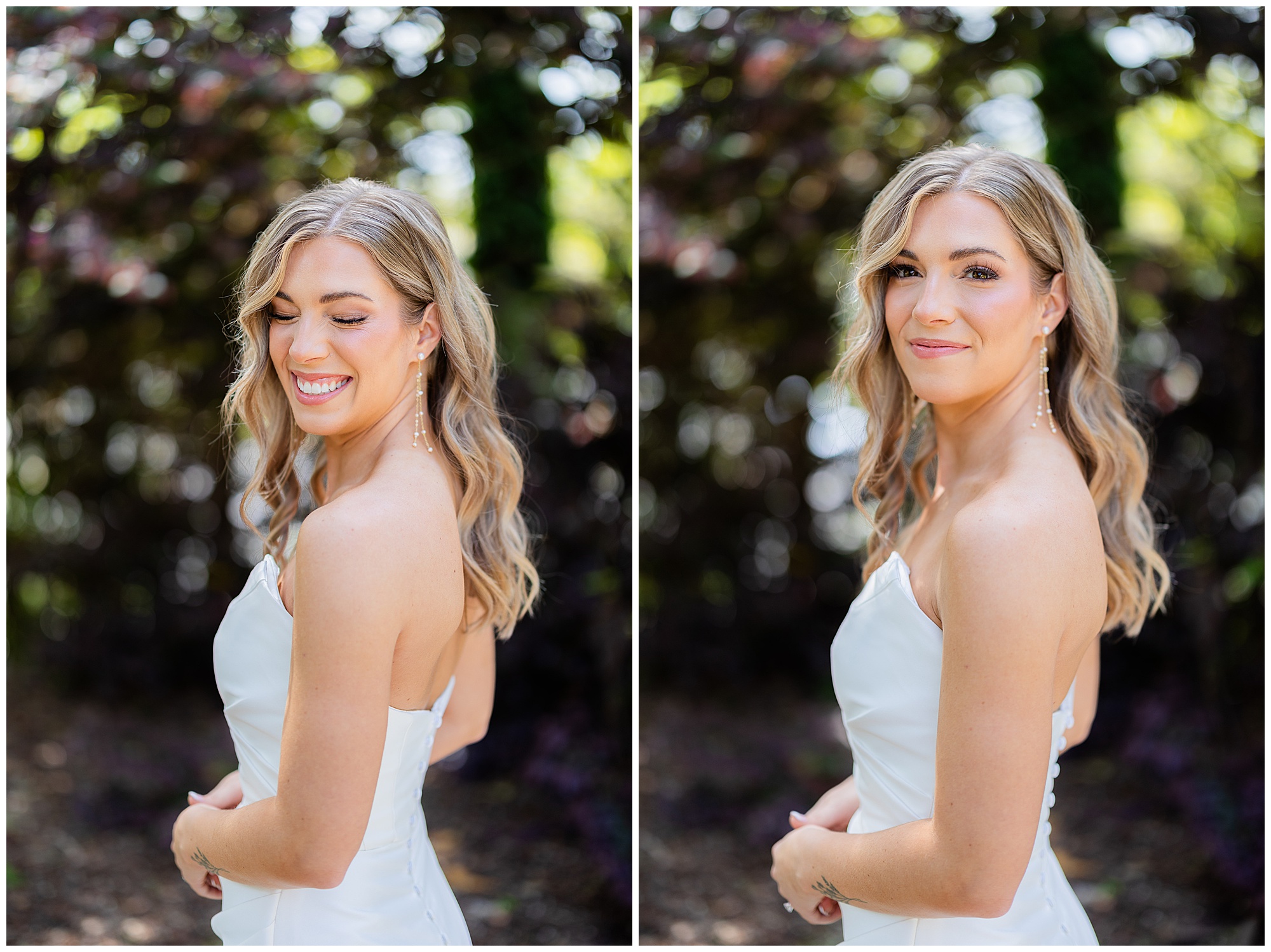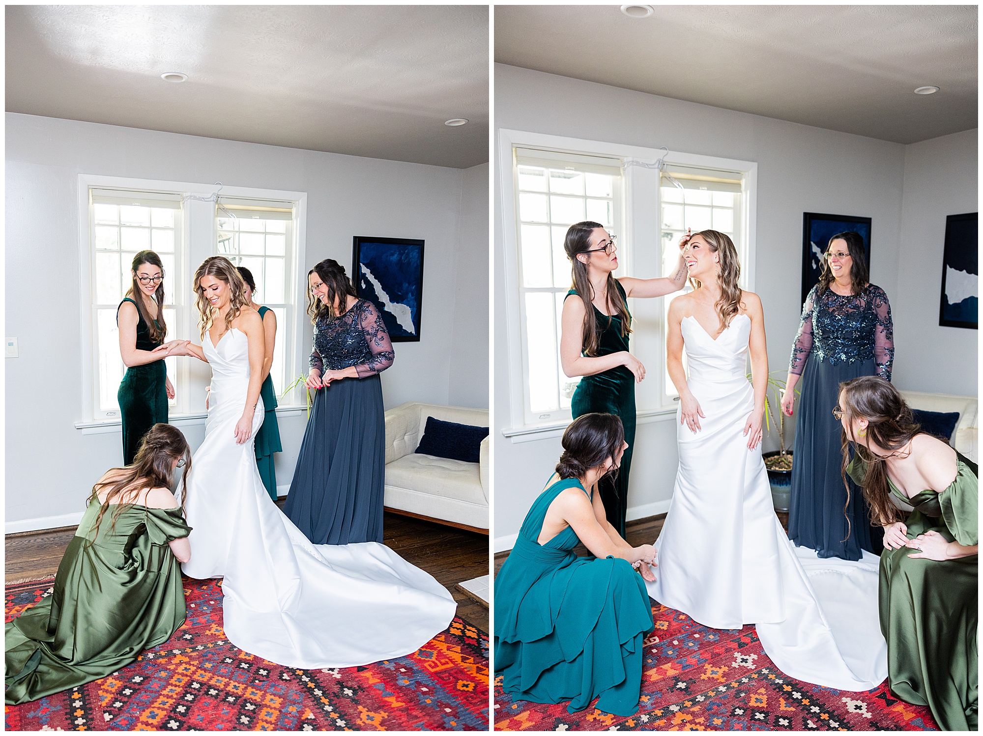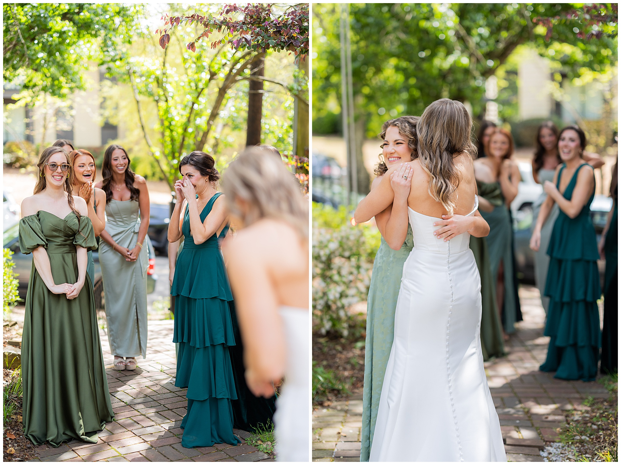 After Jo’s talented hair and makeup team finished her look (shoutout Hannah Collier!), she slipped on her dress and we hopped outside to take advantage of the sunlight peeking through the trees. Plus, we set up all the bridesmaids so they could have a quick “first look” with their favourite girl. All day long, they couldn’t stop gushing over how gorgeous Johanna was, and I was right there with them!