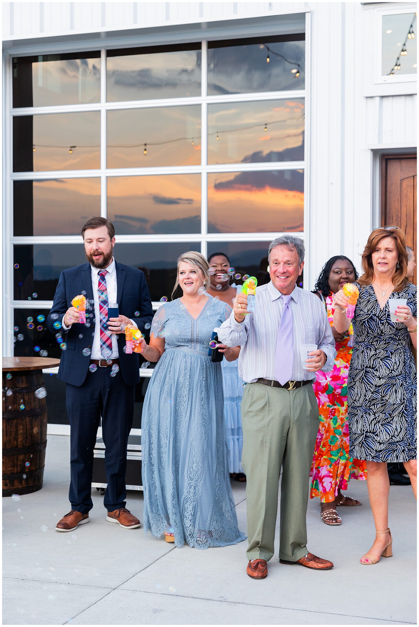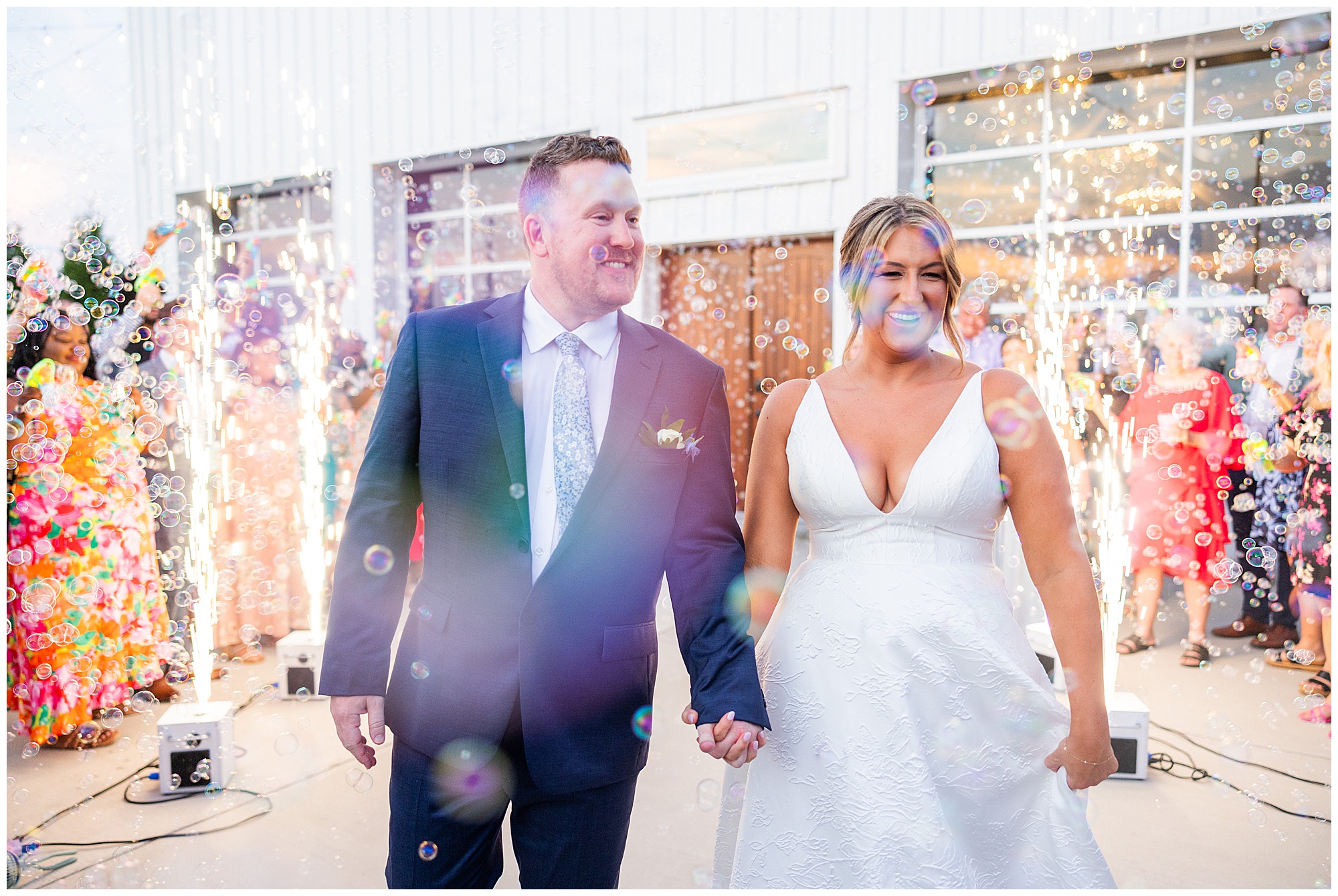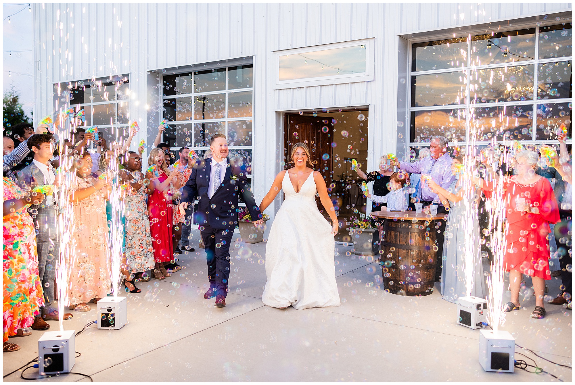 As the sun finished setting on Paige and Matt’s unforgettable day, they opted for a fake exit amidst cold sparks and bubbles during an enchanting “blue hour.” The sky was a painted canvas of pink and purple hues, adding a magical backdrop to the celebration.