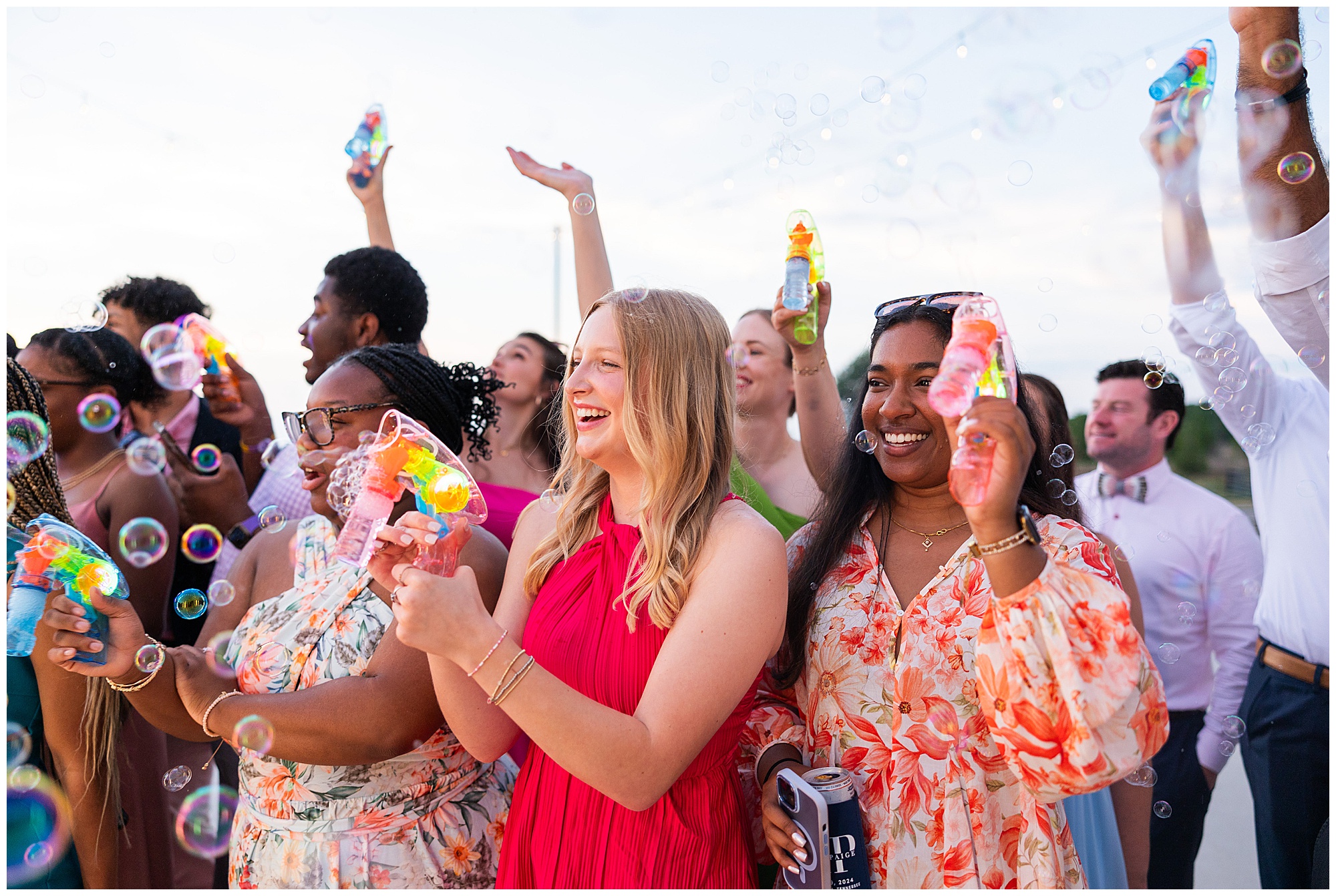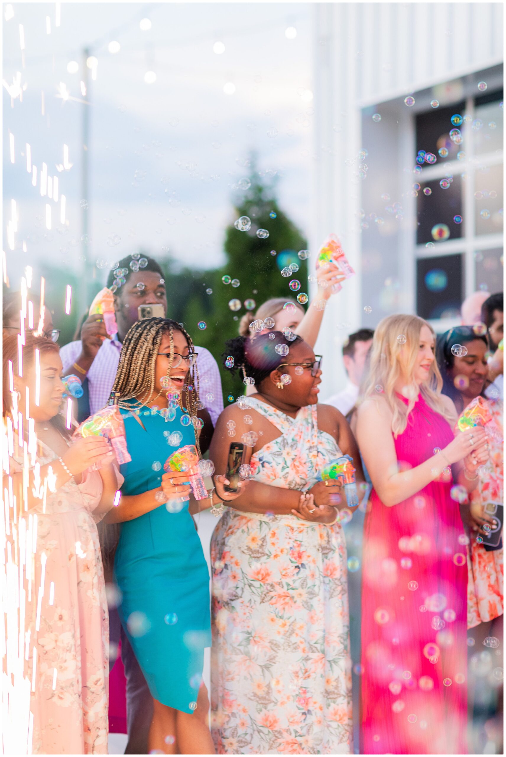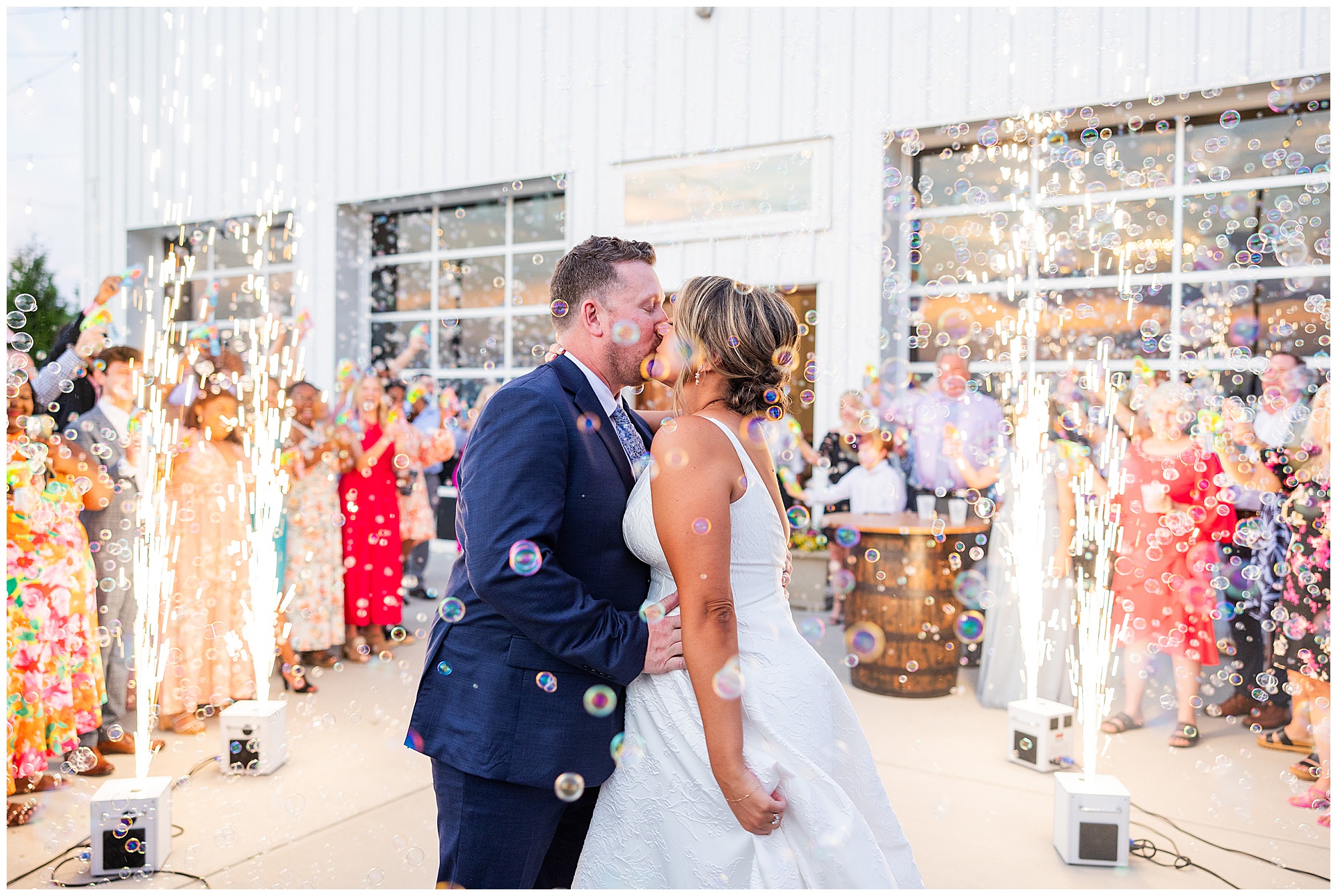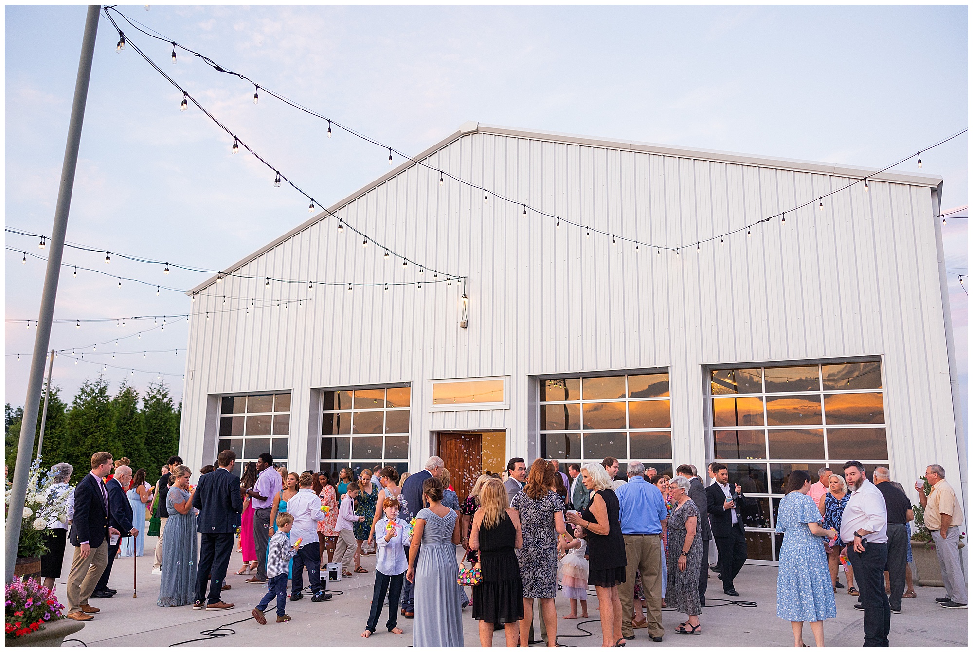 As the sun finished setting on Paige and Matt’s unforgettable day, they opted for a fake exit amidst cold sparks and bubbles during an enchanting “blue hour.” The sky was a painted canvas of pink and purple hues, adding a magical backdrop to the celebration.